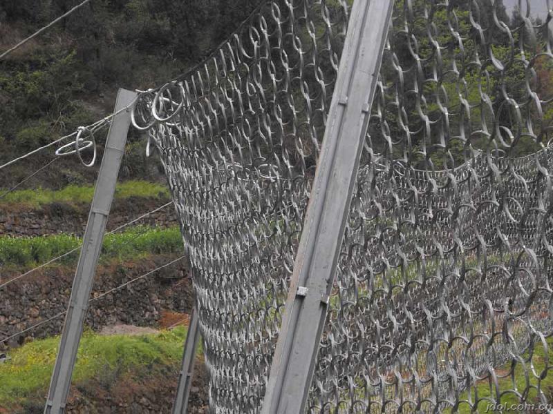 材質(zhì):鋼絲繩網(wǎng)、支撐繩和減壓環(huán)構造:由鋼絲繩網(wǎng)或環(huán)形網(wǎng)(需攔截小塊落石時(shí)附加一層鐵絲格柵)、固定系統(錨桿、攔錨繩、基座和支撐繩)、減壓環(huán)和鋼柱四個(gè)主要部分構成。