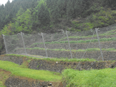 常用規格:[鋼柱(間距10M),帶消能環(huán)的∮16雙支撐繩和∮16“人”字形上拉錨繩(每跨6個(gè)消能環(huán)),∮16側拉錨繩(單繩),DO/08/300/5*5㎡鋼絲繩網(wǎng),∮8縫合繩,格柵網(wǎng)]